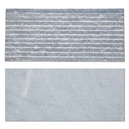 The BlueStone Marble Split-Face RAKED veneer presents bold blue-gray movement with a hand-raked, chiseled texture in an 8×18 format for striking wall applications. At 5/8″ thick, each piece covers 1 sq ft (8 sq ft per box), delivering durable, dimensional appeal across continuous veneer layouts.
