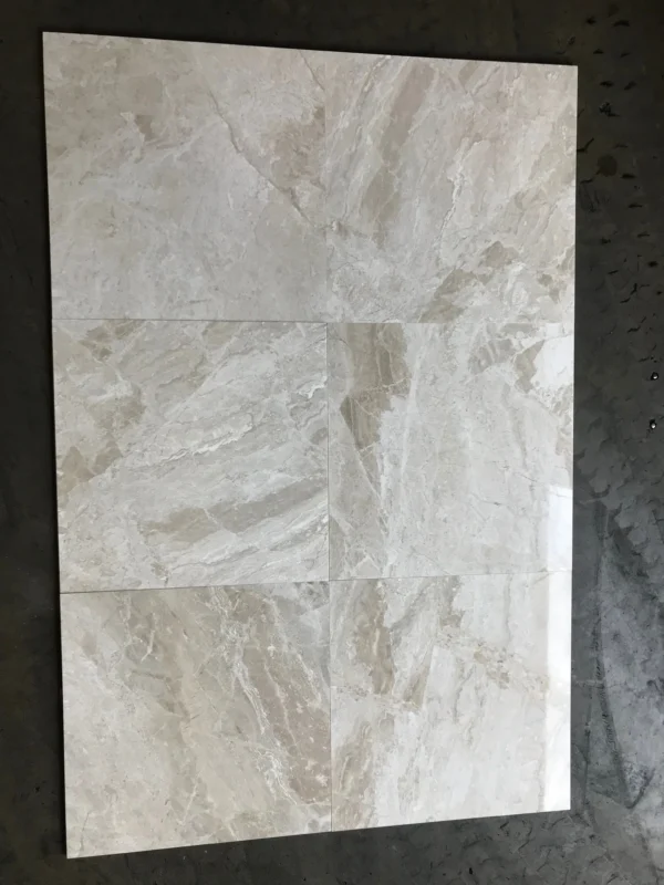The Breccia Bianco (Diana Royal) Marble Tile arrives in a radiant polished finish with a spacious 24×24 size and sturdy 1/2 inch thickness, highlighting warm cream tones and refined veining. Each 4 sq ft piece creates a seamless, luxurious surface ideal for statement floors or expansive wall treatments.