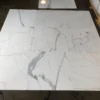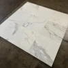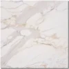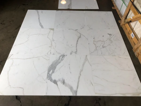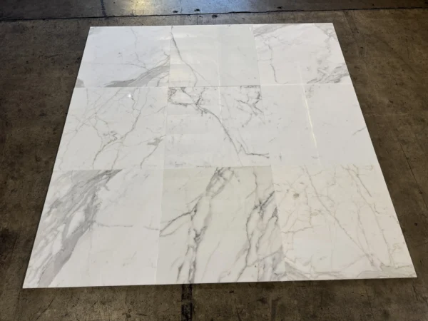 The Calacatta Gold Marble Tile in a polished finish comes in a 24×24 large-format size with a 3/8 in. thickness for dramatic visual impact. Each tile covers 4 sq ft, delivering a mirror-like sheen that elevates the stone’s luxurious gold veining.