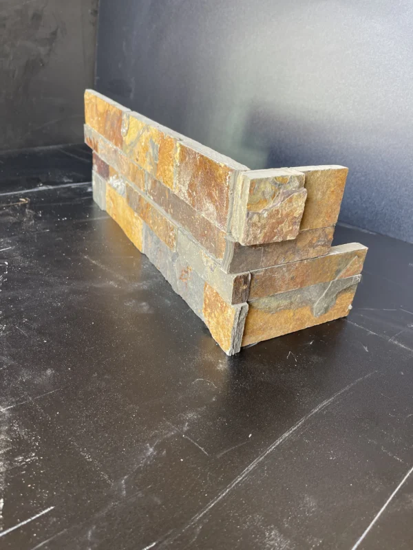 California Gold Slate Ledger Corner pieces seamlessly wrap edges with matching slate texture, bringing depth and continuity to stone walls or fireplaces. Durable 3/4″ slate ensures a lasting finish.