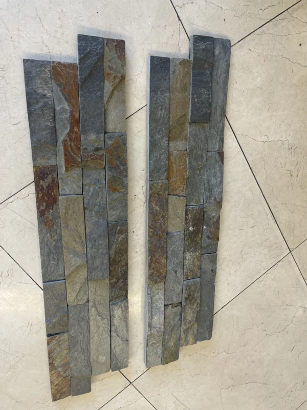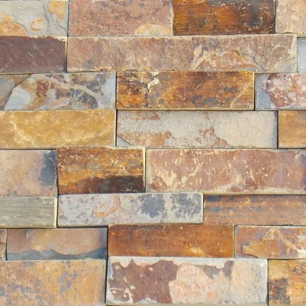 The California Gold Slate Ledger Panel is sized at 6×24 with a 3/4-inch thickness, bringing natural slate character to vertical surfaces. Variegated, earthy tones and a layered texture add warmth and dimension to accent walls, fireplaces, and facades.