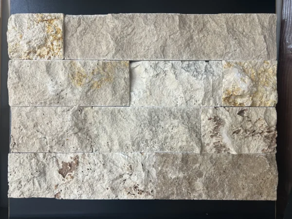 The 4″ x Random Ivory Travertine Split-Face showcases warm ivory tones and a chiseled texture that adds dimension to vertical surfaces. Built in a 4″ course height with random lengths and a 1″ nominal thickness, it is packaged at 5.56 SF per box (18 boxes per pallet).