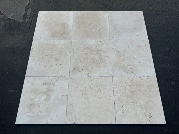 Alabastrino (Ivory) travertine in a tumbled 18×18 format, 1/2 inch thick, showcases warm ivory tones and softly weathered edges for authentic, natural character. Durable and timeless, it brings rustic elegance to floors and walls in both classic and contemporary spaces.