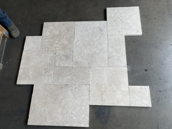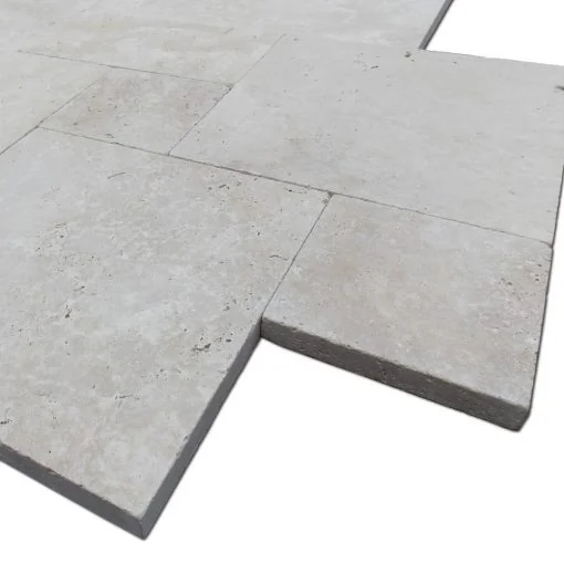 Ivory Pavers Versailles Pattern Tumbled Travertine Pavers bring timeless charm and textured elegance to patios and walkways. Their durable, slip-resistant finish makes them a perfect choice for luxurious yet practical hardscaping.