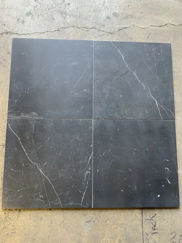 Nero Marquina Honed 12×12 marble features deep black stone with striking white veining and a silky, low-sheen honed finish. At 3/8-inch thick and 1 sq ft per piece, it lends modern understatement and durability to refined floors and feature walls.