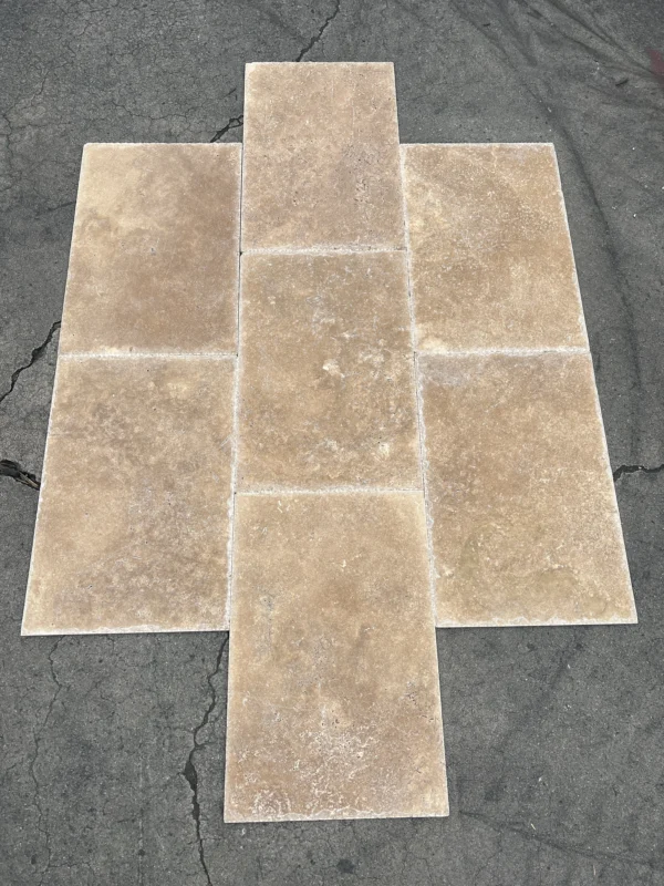 Walnut Brushed/Chiseled 16×24 travertine combines a gently textured face with chiseled edges for timeworn character. At 1/2 in thick and 2.67 sq ft per piece, it adds rustic elegance to interior and exterior designs.
