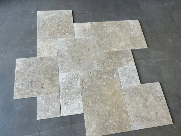 Elevate your space with Walnut Travertine Versailles Tumbled Pattern tiles. Their timeless pattern and tumbled finish create an inviting surface for both traditional and modern decors.